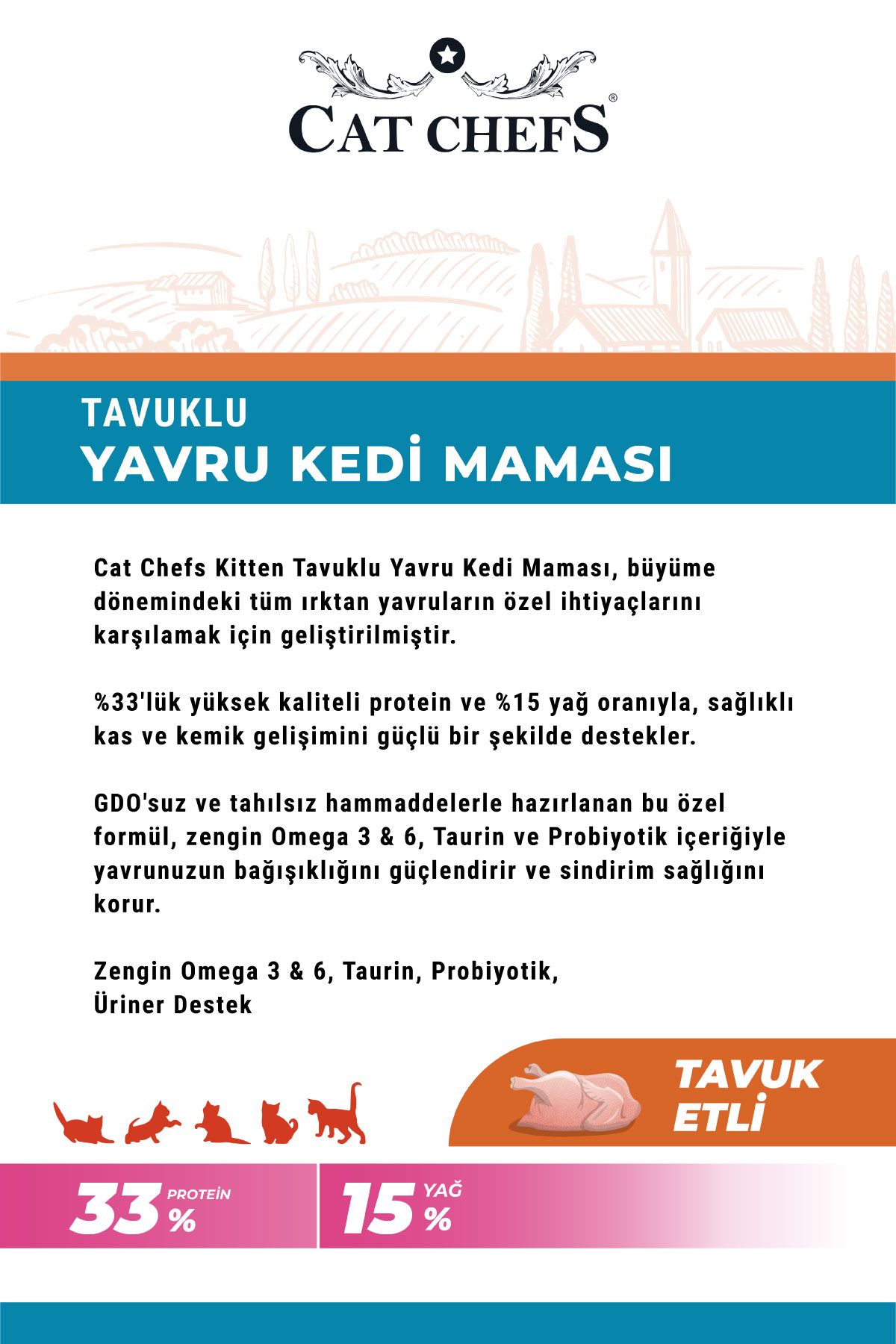 Chicken Kitten Food (Up to 12 Months): Specially formulated with a 33% protein and 15% fat ratio for the healthy growth period of your little friends. With its Grain-Free content, Urinary Support, Probiotics, and high Taurine addition, it supports your kitten's immunity and long-term health.