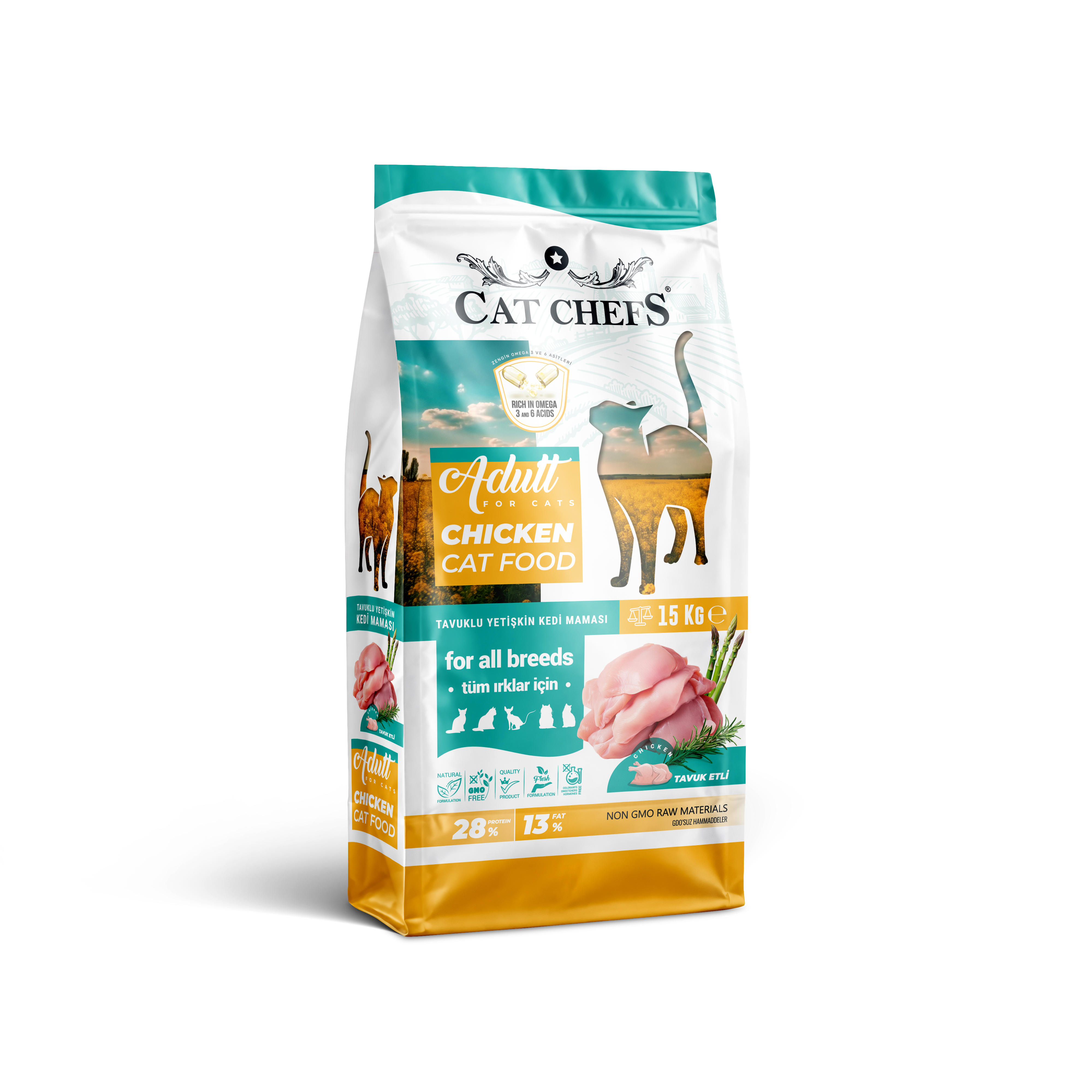 Chicken Adult Cat Food: With its delicious chicken content, it completely and soundly meets the daily energy needs of adult cats of all breeds. Featuring a 28% protein and 13% fat ratio, this formula is a complete meal for your cat's daily nutrition.