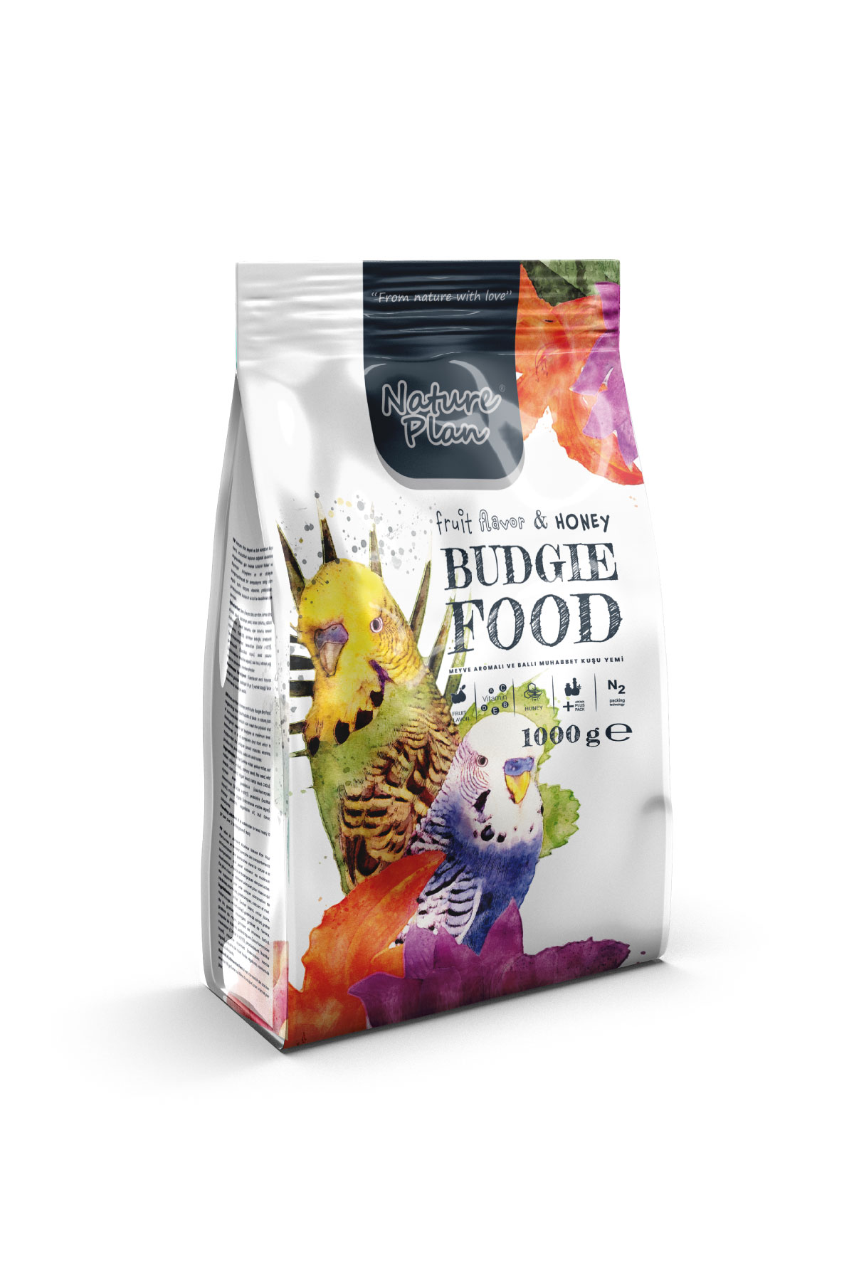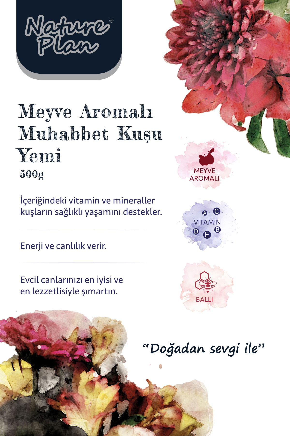 Nature Plan Muhabbet Kuşu Yemi, muhabbet kuşlarının doğadaki beslenme alışkanlıkları göz önünde tutularak fiziksel ve biyolojik ihtiyaçlarını en üst düzeyde karşılayabilecek bir kompozisyona sahip olan eşsiz tahıl karışımı, vitaminler, prebiyotikler, probiyotikler, kalsiyum ve bal ile desteklenen tam yemdir.
