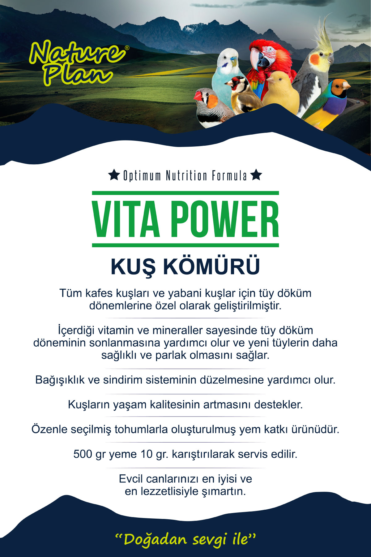 Tüm kafes kuşları ve yabani kuşlar için tüy döküm dönemlerine özel olarak geliştirilmiş bir mineral ve vitamin yapısı sayesinde tüy döküm döneminin sonlanmasına yardımcı olur. İçeriğindeki yüksek kalitede DL-metionin sayesinde Yeni tüylerin daha sağlıklı ve parlak olmasını sağlar.