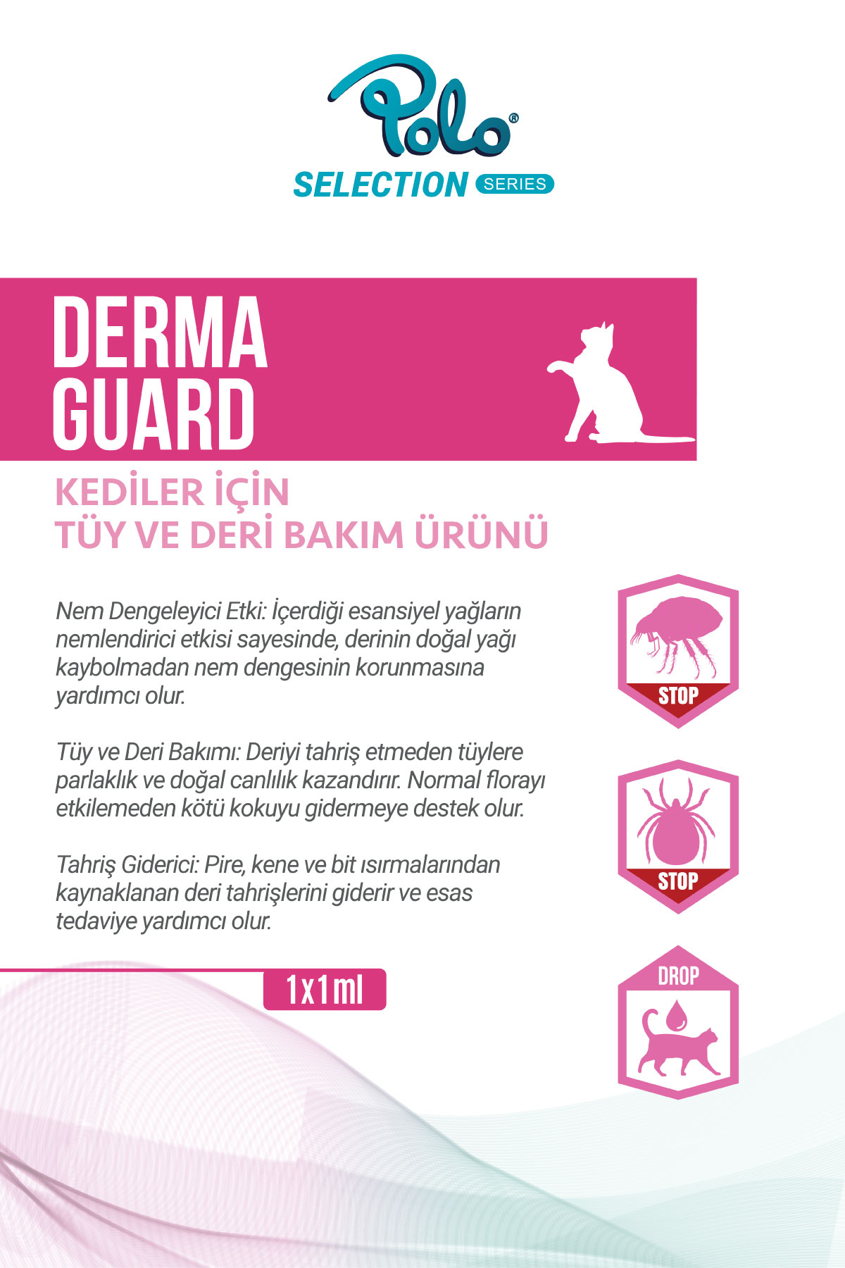 Hem evcil hayvan sahiplerinin evde güvenle uygulayabileceği pratiklikte hem de pet shop ve veteriner kliniklerinin güvenle önerebileceği profesyonellikte formüle edilen Polo Selection Derma Guard, kedilerin (1-7 kg) deri ve tüy sağlığı için çok yönlü bir çözüm sunar.